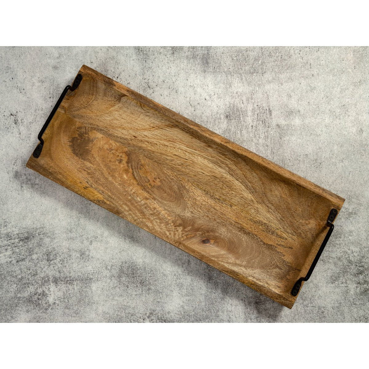 Dit robuuste houten dienblad met een afmeting van circa 50 x 20 x 7 cm is niet alleen functioneel, maar ook een echte eyecatcher in je interieur. Elk exemplaar is uniek dankzij het ambachtelijke vakmanschap en de natuurlijke houtnerf van het mangohout.