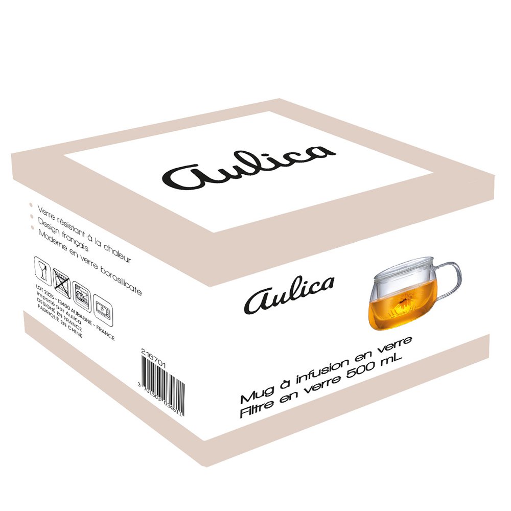 Geniet van jouw favoriete thee in stijl met deze elegante glazen theemok met filter van het Franse merk Aulica. De geïntegreerde glazen infuser maakt het eenvoudig om losse thee te zetten, terwijl het transparante design zorgt voor een verfijnde presentatie van jouw warme drank.
